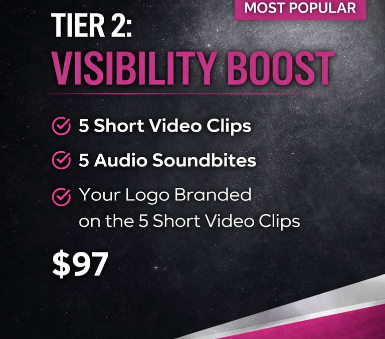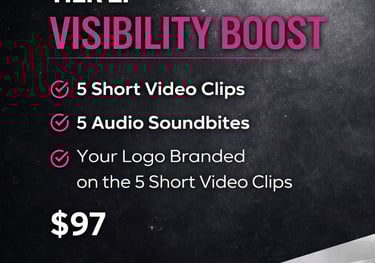 The Visibility Boost package takes your podcast episode and turns it into multiple pieces of content you can use right away—so you can stay visible without the stress of figuring out what to post.