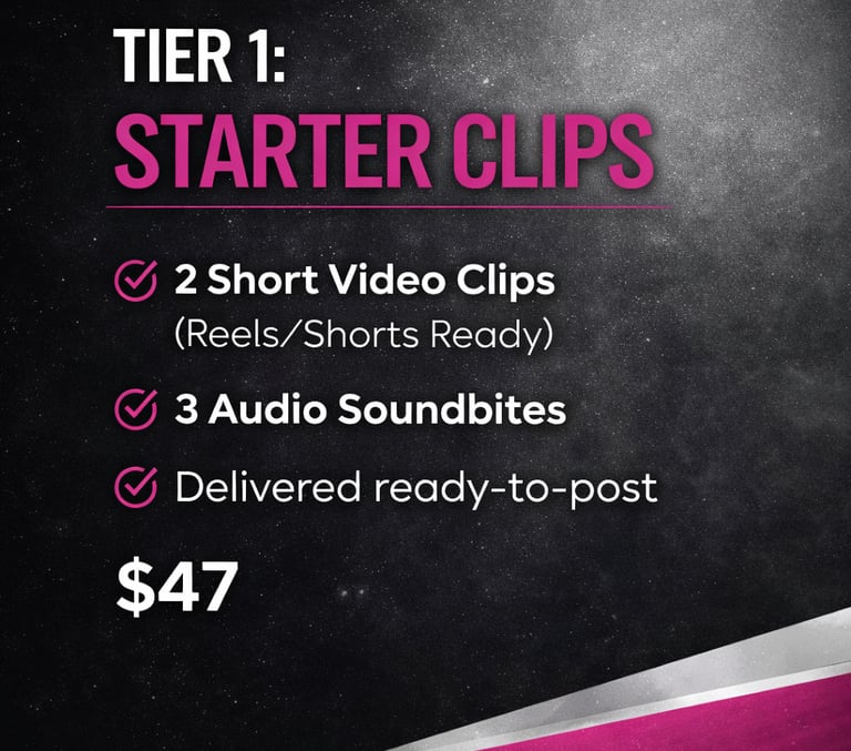 The Starter Clips package is designed for women who want a simple, powerful way to start showing up online, without overthinking what to post.